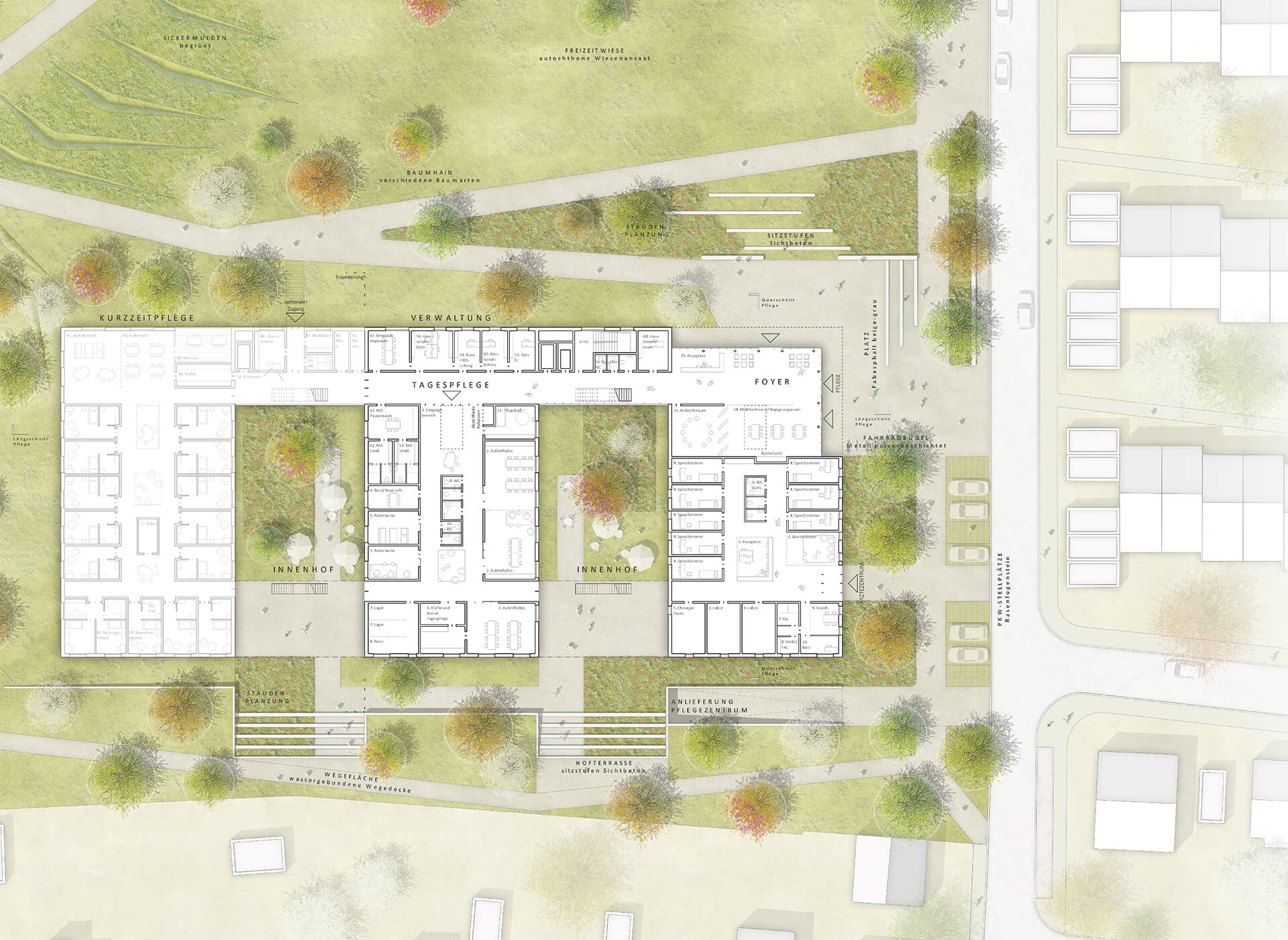 Im südwestlichen Teil des Grundstücks an der Billinger Straße entsteht das neue Pflegezentrum mit verschiedenen Pflegeeinrichtungen und dem Ärztezentrum. Das heutige Martinshaus soll in seinem Charakter weiterhin erkennbar bleiben: Der prägnante Viertelkreis bleibt erhalten und wird anschließend zu einem Vollkreis ergänzt. Dieser wird Teil eines neuen Wohnkonzeptes, dem Generationenhaus. Durch die beiden kompakten Baukörper und deren Anordnung auf dem Grundstück entstehen großzügige Außenanlagenbereiche mit öffentlichen und privaten Räumen.