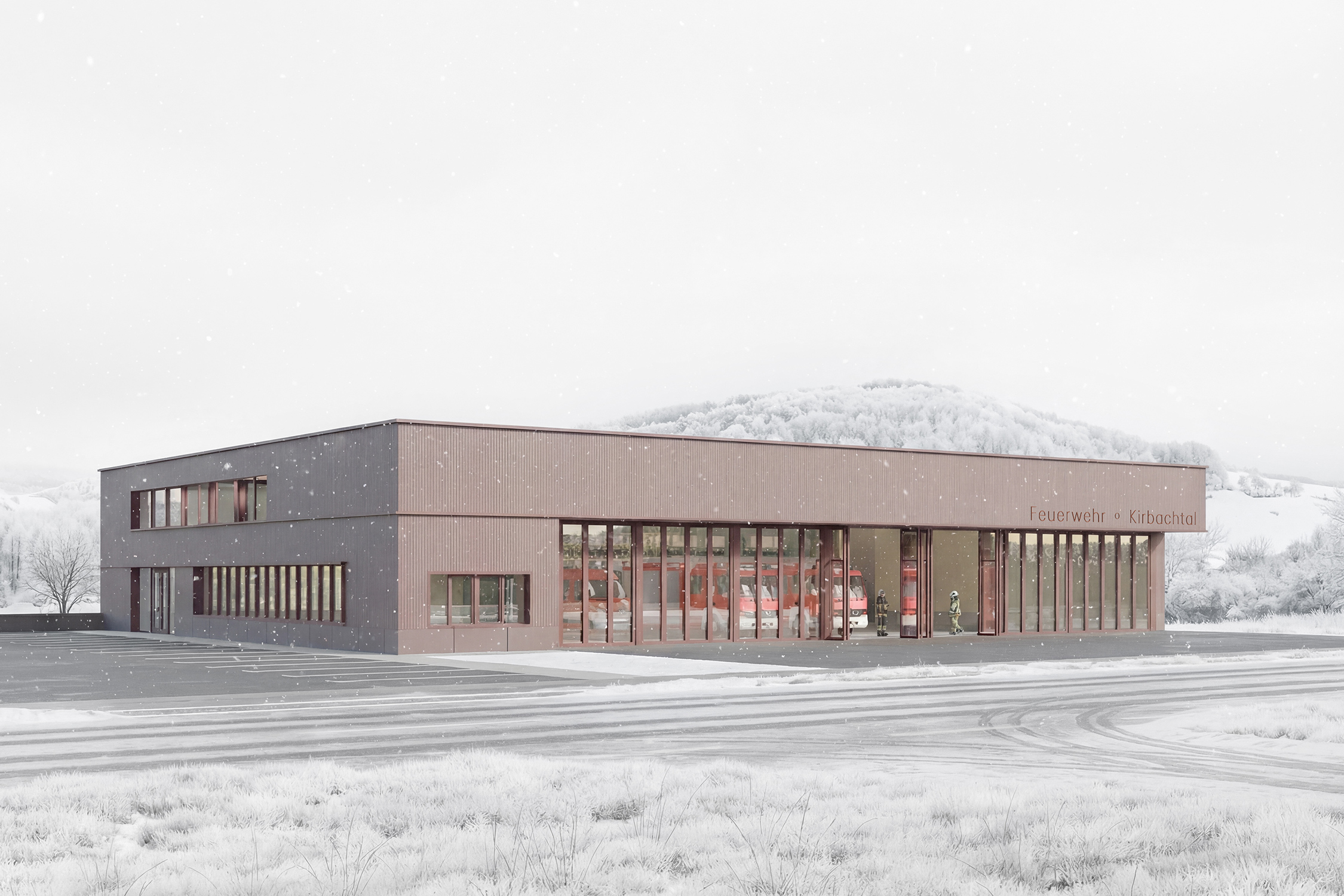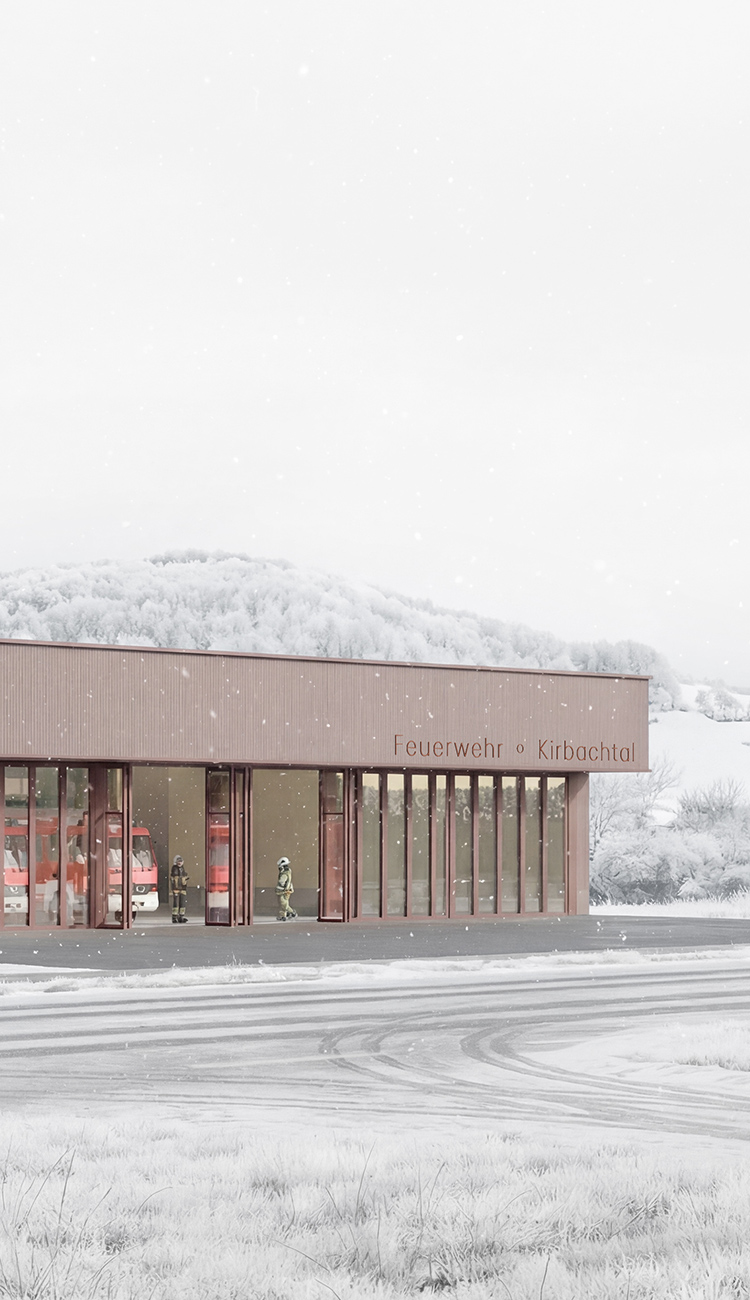 Der Entwurf positioniert einen klar gegliederten, kompakten Baukörper, der sich selbstverständlich in die offene Topografie des Kirbachtals einfügt und einen funktionalen, identitätsstiftenden Einsatzstandort für die ehrenamtlich geprägte Feuerwehr formuliert. Wesentliche Kriterien wie kurze, intuitive Alarmwege, die klare Trennung der Funktionsbereiche sowie die bewusste Konzentration auf das Wesentliche prägen das architektonische Konzept und unterstützen sowohl den operativen Betrieb als auch den Aufenthalt der Nutzer:innen.