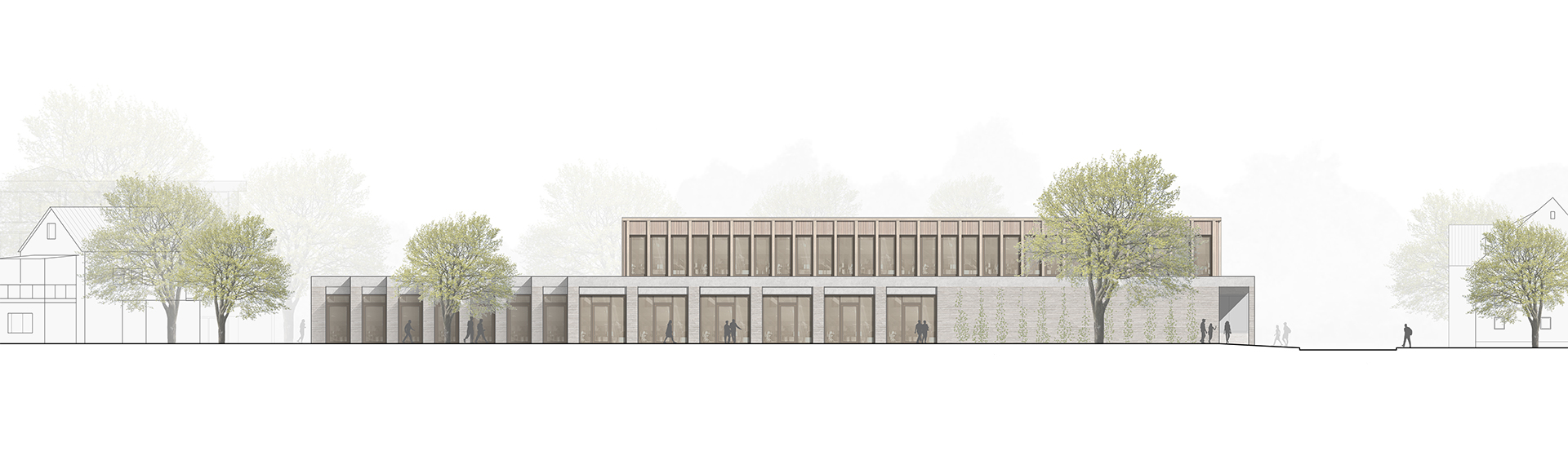 Aufgabe war es die bestehende Sport- und Festhalle zu sanieren und zu erweitern, sowie den vorhandenen Festplatz neu zu gestalten. Die Qualität des Ortes liegt an dem neu zu gestaltenden Festplatz. Die direkte Verknüpfung des Bestandsaals mit dem Festplatz gelingt durch den Rückbau der bestehenden Nebenraumspange im Norden - Hiermit ist es auch möglich, die Ausrichtung des Festsaals umzudrehen und diesen zum Festplatz hin zu öffnen.