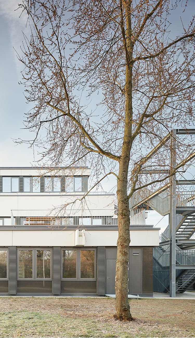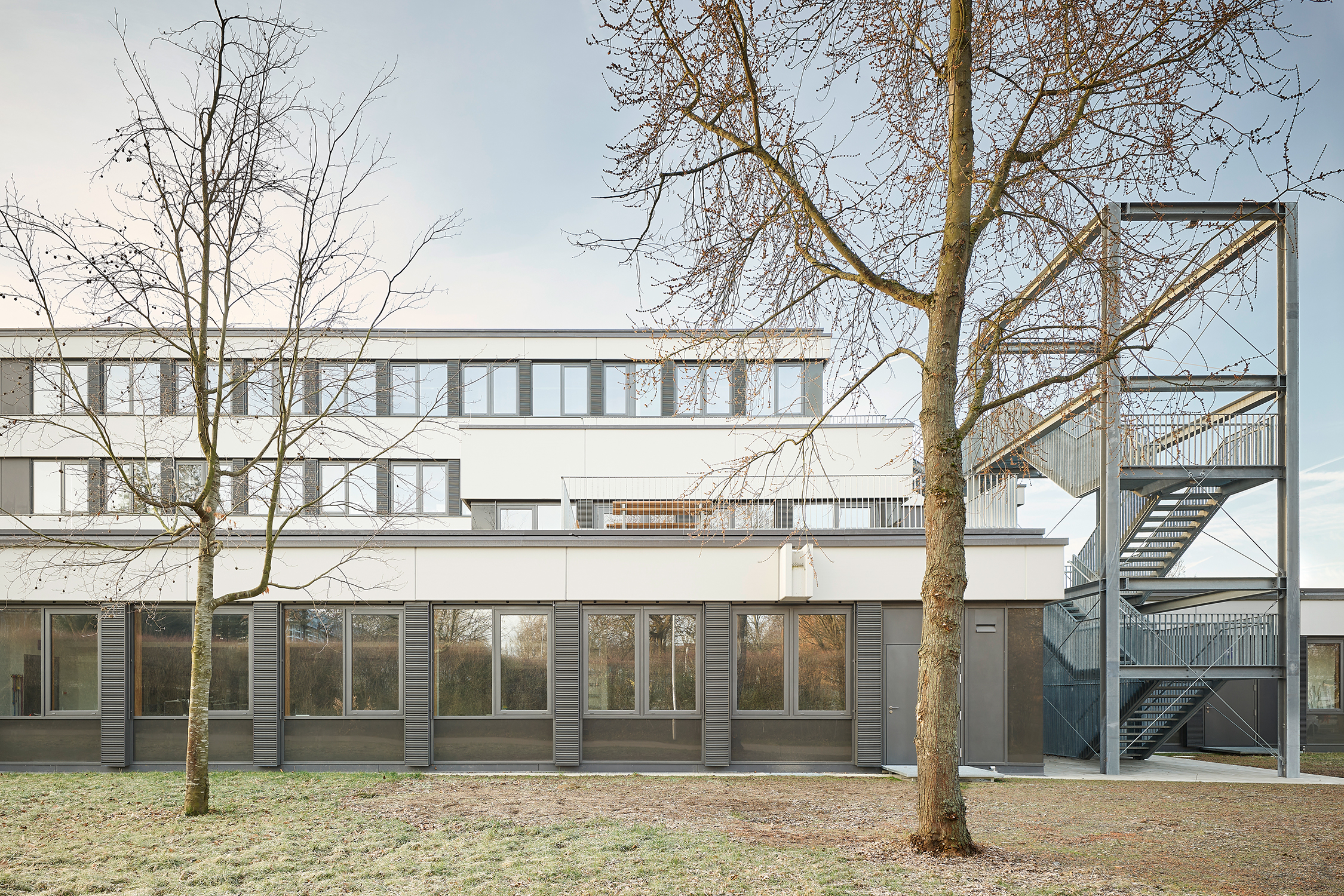 "Ein hervorragendes Beispiel, wie die Bausubstanz von Schulen der 1970er Jahre gewahrt und weiterentwickelt werden kann, ist die behutsame Sanierung dieses Schulgebäudes. Geschickte Eingriffe in die Grundrisse machen die Schule fit für die Lernformate des 21. Jahrhunderts. Integrierte Lüftungselemente in den wertigen Fassaden der Klassenräume ermöglichen eine Lüftung und Nachtauskühlung ohne aufwendige Technik. Die im Wesentlichen sichtbaren Materialien wie Lärchenholz, Linoleum und Sichtbeton wirken durch ihre natürlichen, hellen Farben und verleihen der Schule ein neues, freundliches Ambiente. Auch wenn der Ursprung der Schule in den siebziger Jahren nicht verleugnet wird, entsteht eine Lernlandschaft, die alle Anforderungen des zeitgenössischen Schulbaus auf überzeugende Weise umsetzten kann. Das Gelingen dieser anspruchsvollen Bauaufgabe wird von der Jury ausdrücklich gewürdigt."