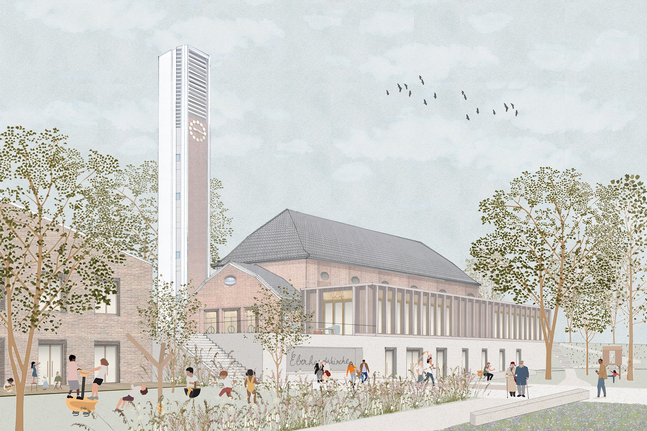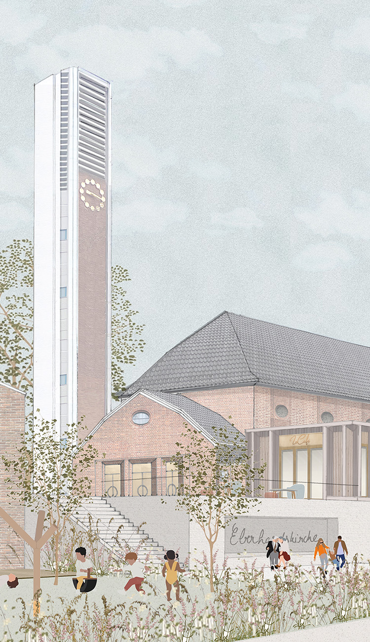 Die behutsame Umnutzung der Eberhardskirche von 1909 zu einem neuen Ort der Begegnung, die Transformation des bisherigen Gemeindezentrums in einen Kindergarten, sowie den Neubau eines Wohngebäudes mit 20 Wohnungen auf dem Gelände des ehemaligen Kindergartens.