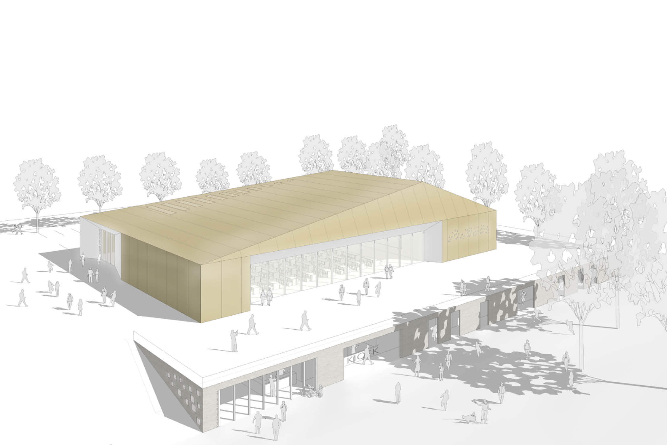 Das neue Bürgerhaus positioniert sich gut sichtbar entlang der Hauptstraße und bildet einen prägnanten und repräsentativen Auftakt für die Gemeinde Birkenau. Die vorhandene Topographie wird genutzt, um das Bürgerhaus und den Eingangs-/Festplatz auf Straßenniveau zu platzieren. Die Freibadnutzungen liegen damit auf einer Ebene mit der Liegewiese.