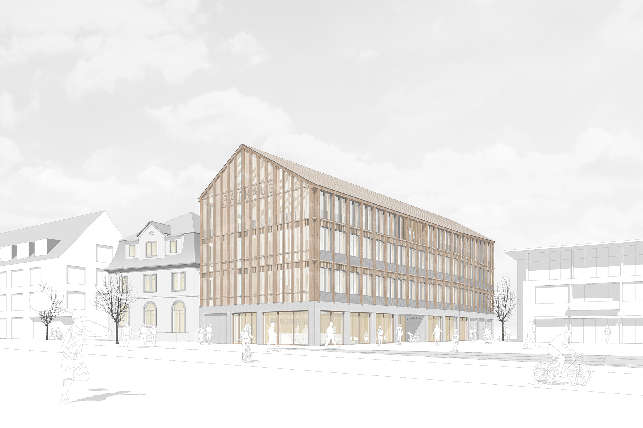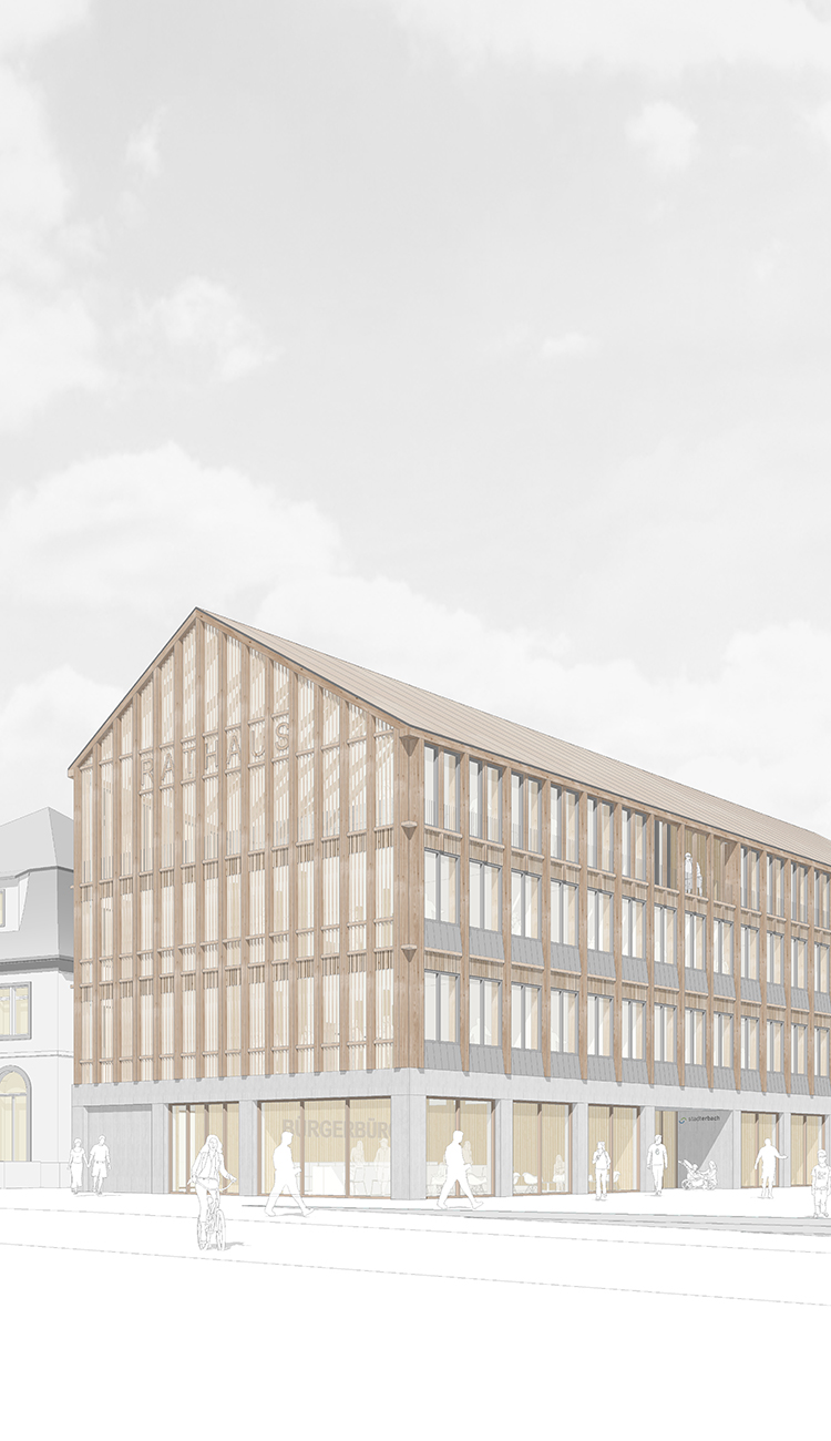 Der Rathausneubau wird als klarer, viergeschossiger, länglicher Stadtbaustein vorgeschlagen, der sich nun selbstbewusst, einem Rathaus angemessen, im Straßenraum präsentiert. Der Neubau nimmt die Richtung der gegenüberliegenden Häuser auf, wodurch der Marktplatz an Fläche gewinnt und sich zur Erlenbachstraße einladend aufspreizt.
