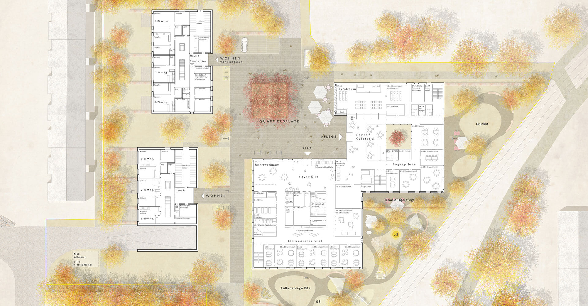 Der Neubau versteht sich als Quartierszentrum für die Nachbarschaft und soll mit seinen vielfältigen Nutzungen unter dem Dach Vorbild für ein Miteinander sein. Dieser Gedanke wird auch in den Außenraum getragen und zeigt sich vor allem in dem gemeinsamen Quartiersplatz mit seiner hohen Aufenthaltsqualität und in den differenzierten Freibereichen der verschiedenen Nutzer:innen und Bewohner:innen des Neubaus. Das neue Generationenhaus vereint alle geforderten Nutzungen in Form von Pflegezentrum, Tagespflege, Gemeinderäume und Kindertagesstätte in einem Haus. Der Wohnungsbau verteilt sich über zwei Gebäude, die zusammen mit dem Generationenhaus eine gemeinsame Mitte, den Quartiersplatz, bilden.