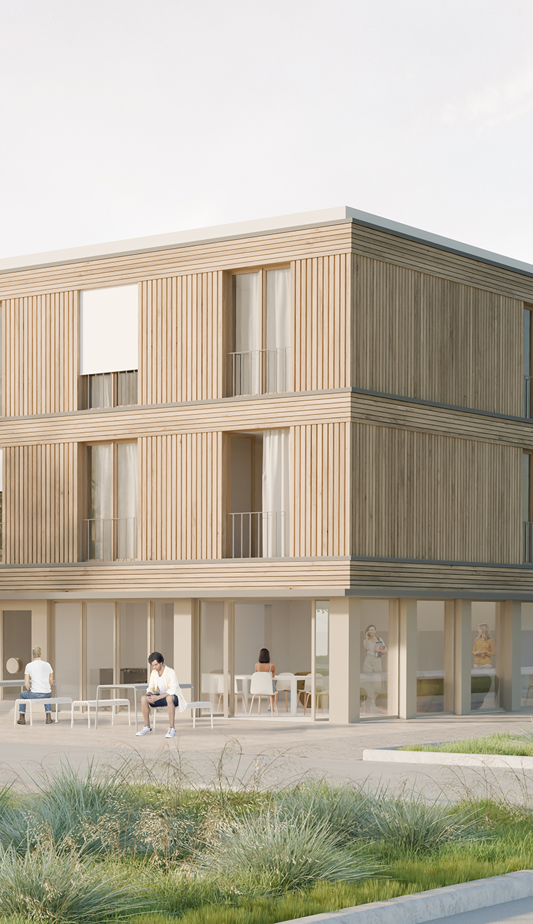 Ein neues Zuhause für Studierende in Neu-Ulm. Entlang der Kingsleystraße entsteht ein klarer, kompakter Zweibund, der sich selbstverständlich in die Umgebung einfügt. An der Kreuzung zur Filchnerstraße öffnet sich das Haus mit einer einladenden Geste zum Stadtraum – ein überdachtes Entrée und ein kleiner Vorplatz markieren die Adresse des neuen Studierendenwohnheims. Im Inneren prägt eine einfache, nachvollziehbare Struktur das Haus: Ein Mittelflur erschließt zweiseitig angeordnete Appartements, helle Flure mit Blickbezügen nach außen schaffen Orientierung und vermeiden Enge. Gemeinschaftsräume am Vorplatz bilden das kommunikative Herz des Hauses, während ruhige, klar geschnittene Individualräume Raum für Rückzug bieten.