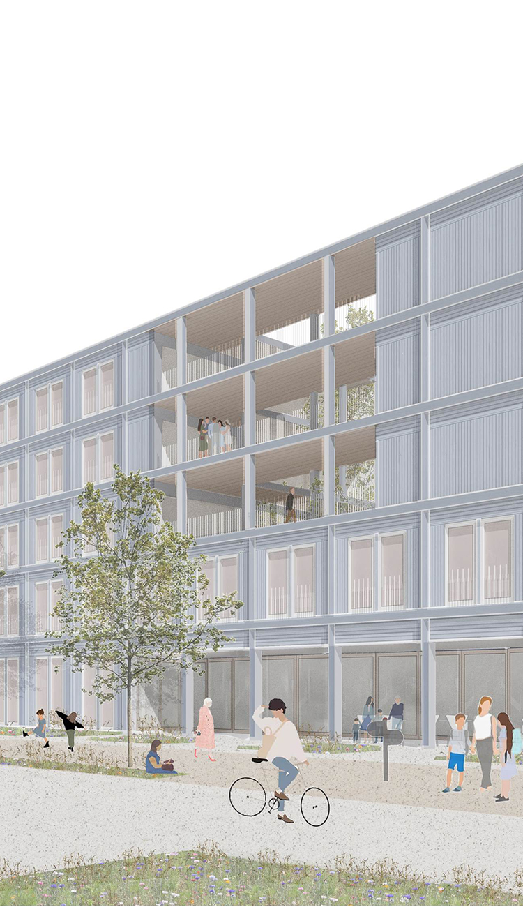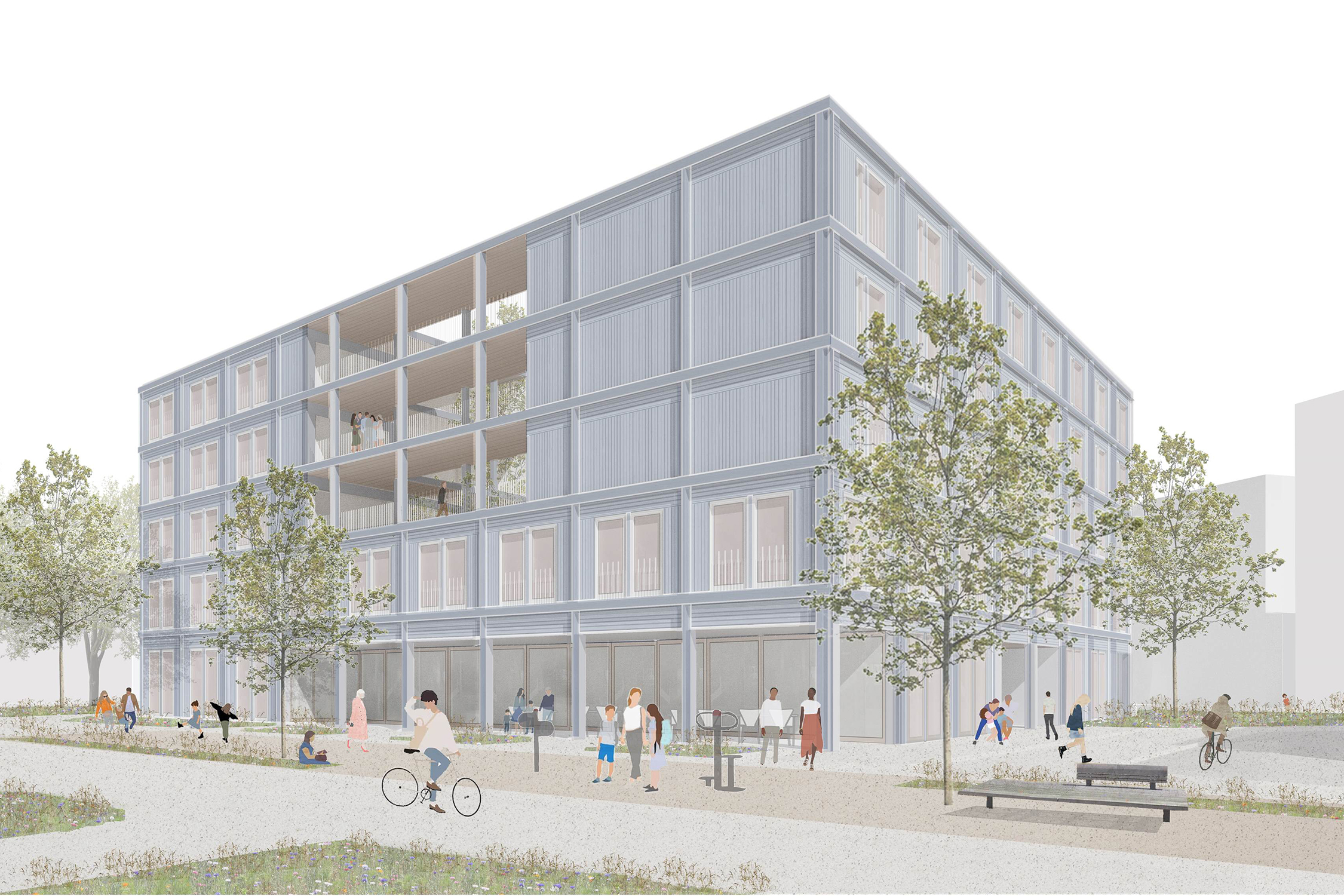Die Lebenshilfe Böblingen gGmbH plant ein Kompetenzzentrum für Menschen mit Behinderung und deren Angehörige. Die Herausforderung besteht darin, auf einem knappen Grundstück am Rand des Stadtteils Flugfeld Böblingen einen bunten Nutzungsmix aus diversen Assistenz- und Therapiebereichen, Wohngruppenangeboten, einer inklusiven KiTa mit Außenbereich, einem Verwaltungstrakt und einem Quartierscafé zu organisieren. Unsere Antwort darauf ist ein kompakter 5-geschossiger Baukörper mit gestapelten Nutzungen: in den unteren zwei Geschossen die öffentlicheren Bereiche, und in den oberen drei Geschossen mit eingeschnittenem Freibereich die ruhigeren Nutzungen. Bis auf das Untergeschoss und die Erschließungskerne aus Stahlbeton wird die Konstruktion als Holzbau vorgeschlagen.